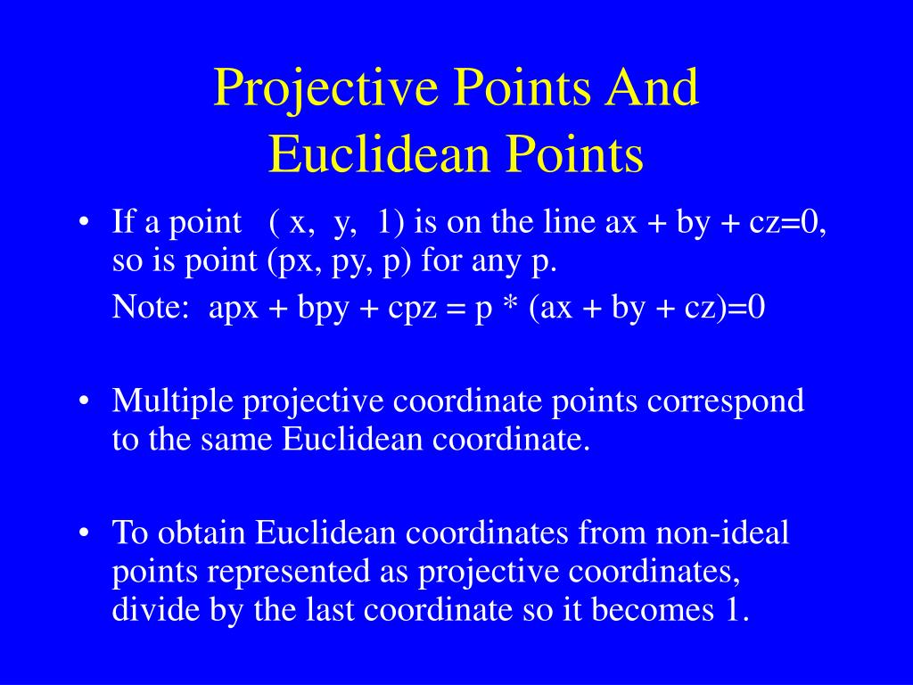 Projective Points AndEuclidean Points • If a point ( x, y, 1) is on the line ax + by + cz=0, so is point (px, py, p) for any p. Note: apx + bpy + cpz = p * (ax + by + cz)=0 • Multiple projective coordinate points correspond to the same Euclidean coordinate. • To obtain Euclidean coordinates from non-ideal points represented as projective coordinates, divide by the last coordinate so it becomes 1.