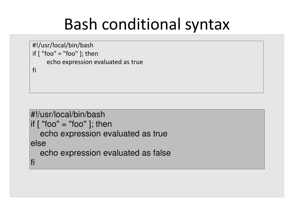 Bash conditional syntax #!/usr/local/bin/bash if [ "foo" = "foo" ]; then echo expression evaluated as true fi #!/usr/local/bin/bash if [ "foo" = "foo" ]; then echo expression evaluated as true else echo expression evaluated as false fi