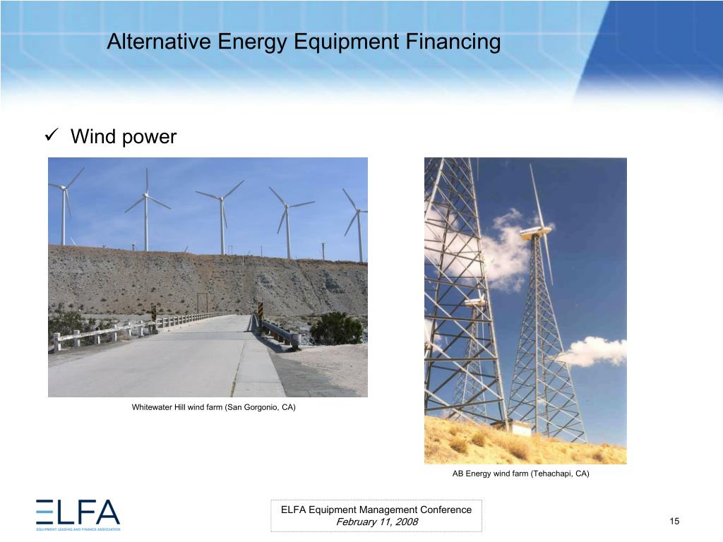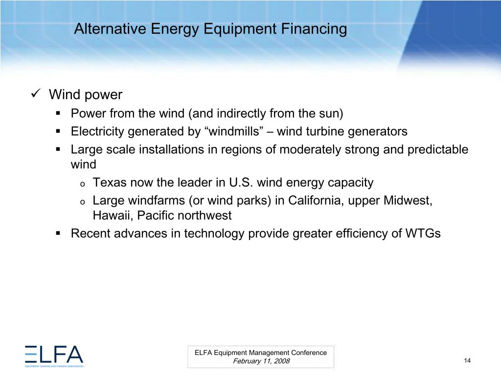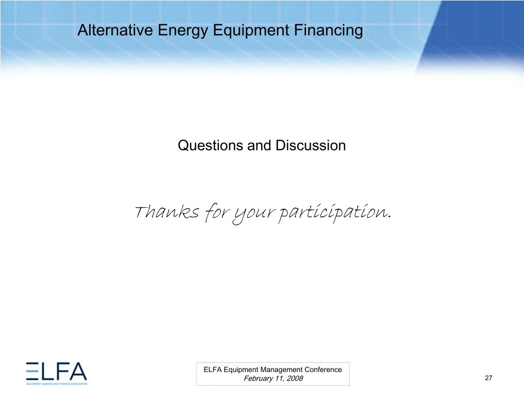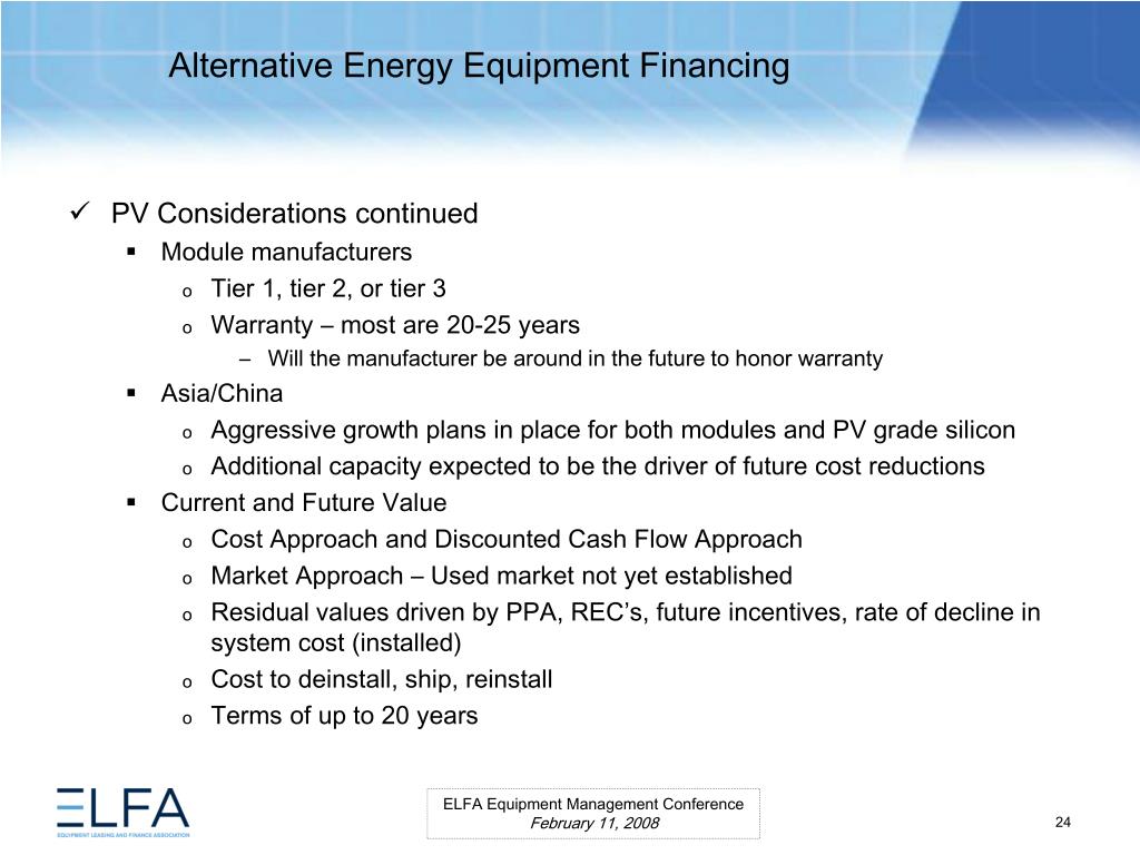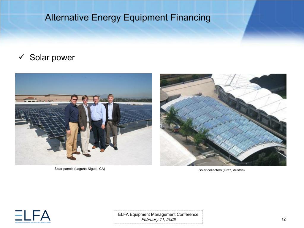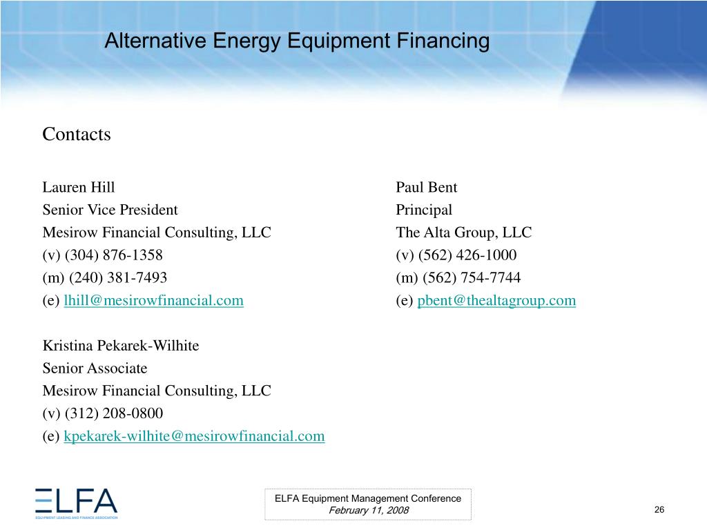 Alternative Energy Equipment Financing. ELFA Equipment Management Conference Miami, Florida February 11, 2008. Moderator Ms. Lauren Hill Senior Vice President MESIROW FINANCIAL CONSULTING . Panelists Paul Bent Principal The Alta Group, LLC Ms. Kristina Pekarek-Wilhite
