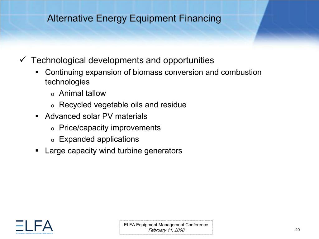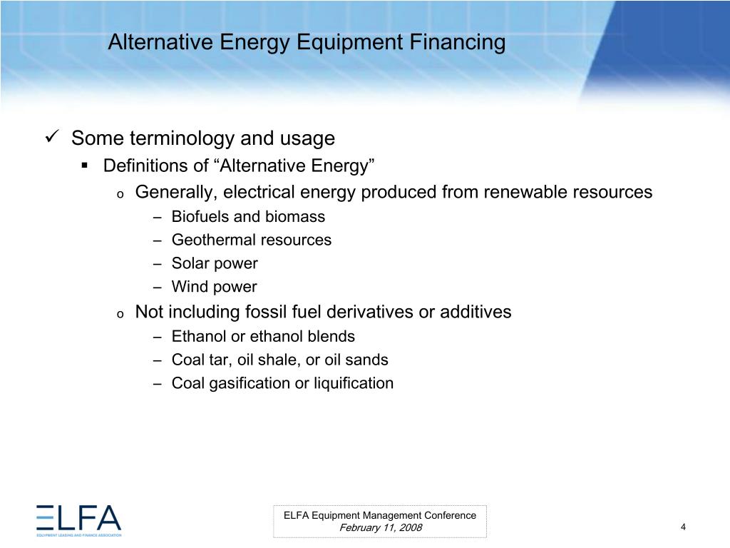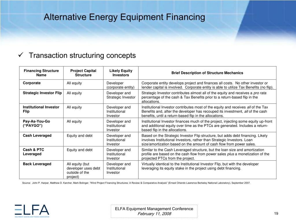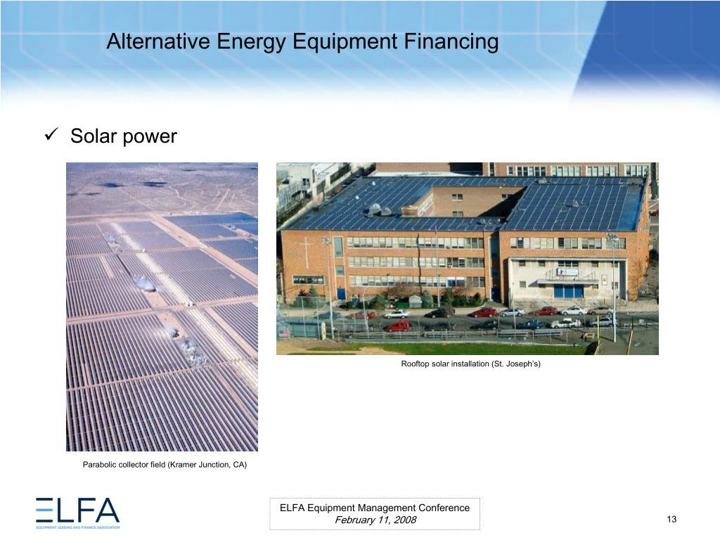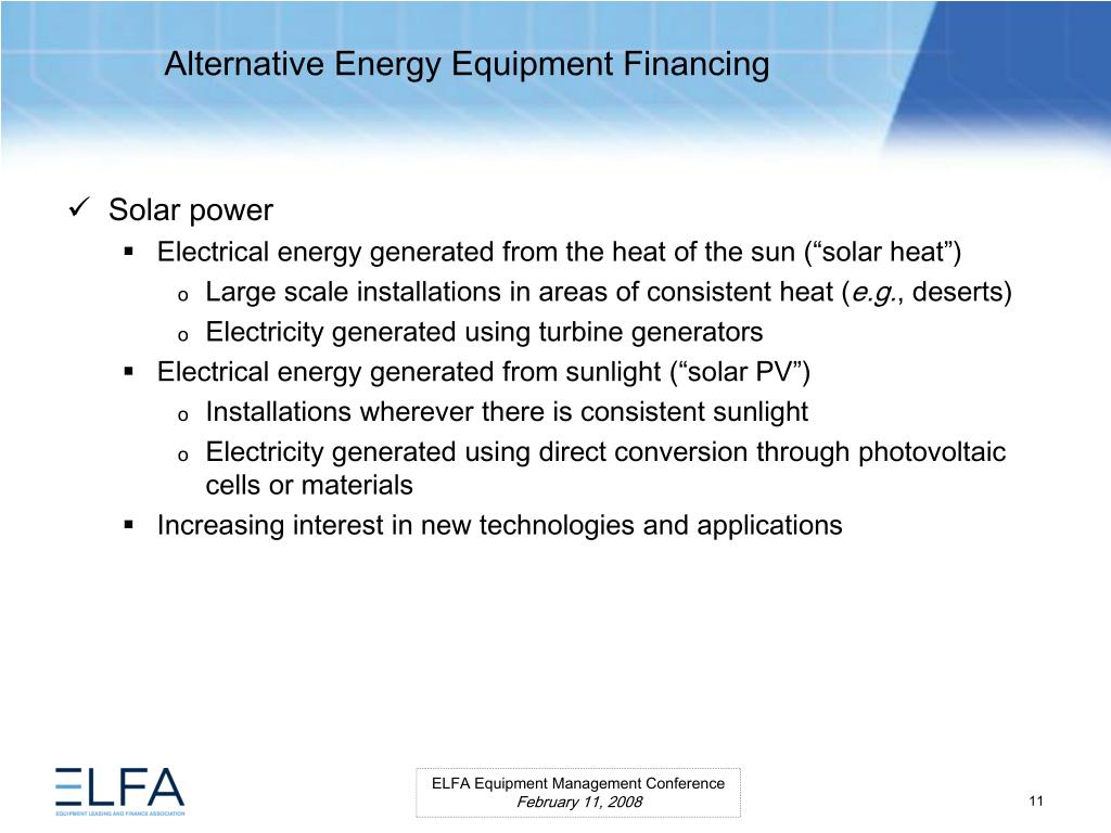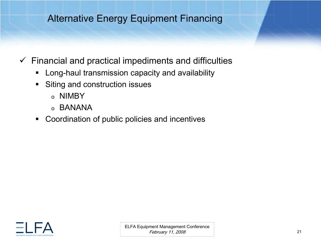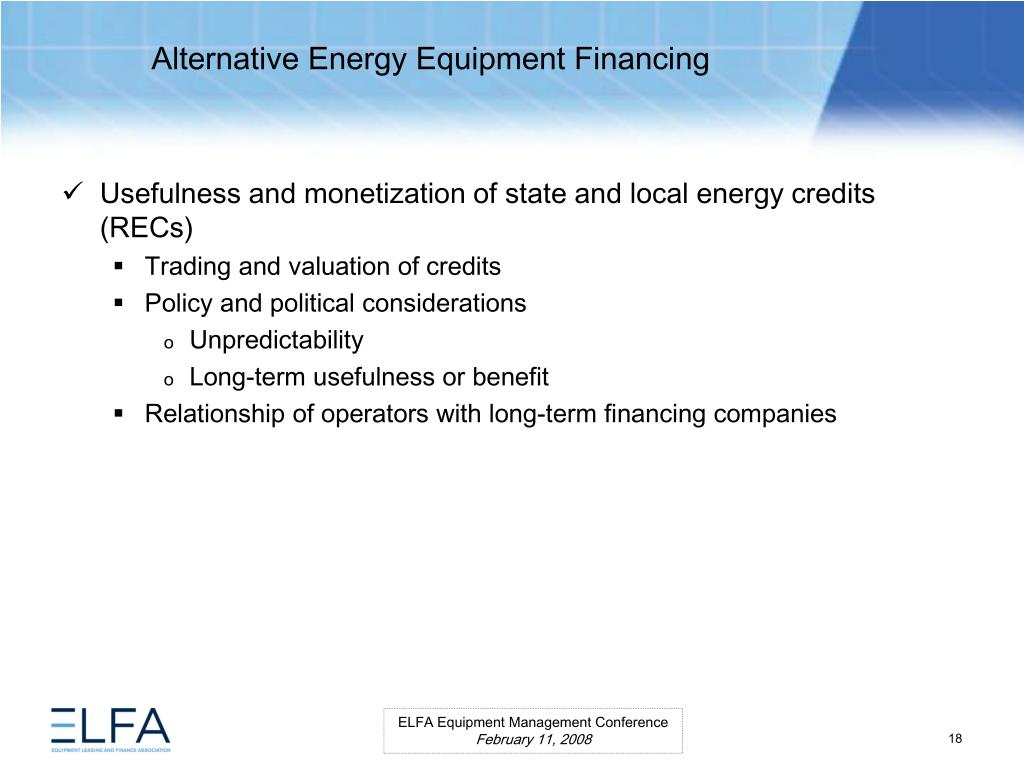 Alternative Energy Equipment Financing. ELFA Equipment Management Conference Miami, Florida February 11, 2008. Moderator Ms. Lauren Hill Senior Vice President MESIROW FINANCIAL CONSULTING . Panelists Paul Bent Principal The Alta Group, LLC Ms. Kristina Pekarek-Wilhite