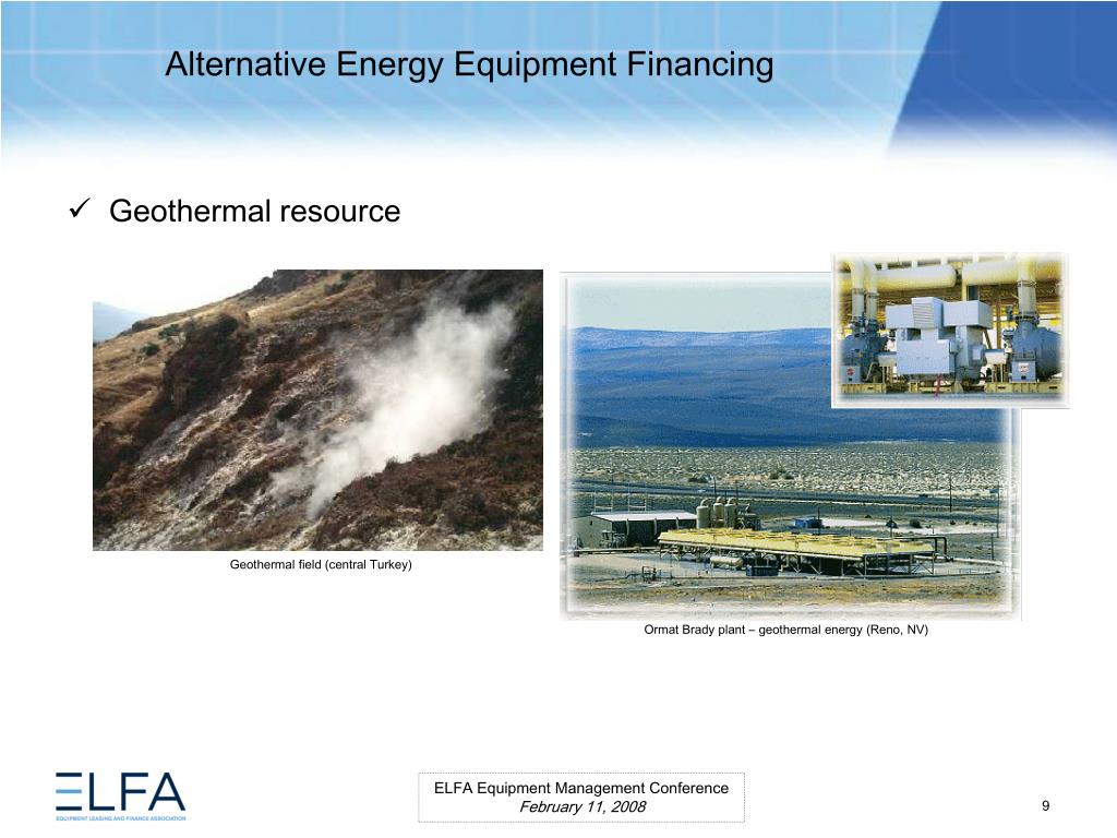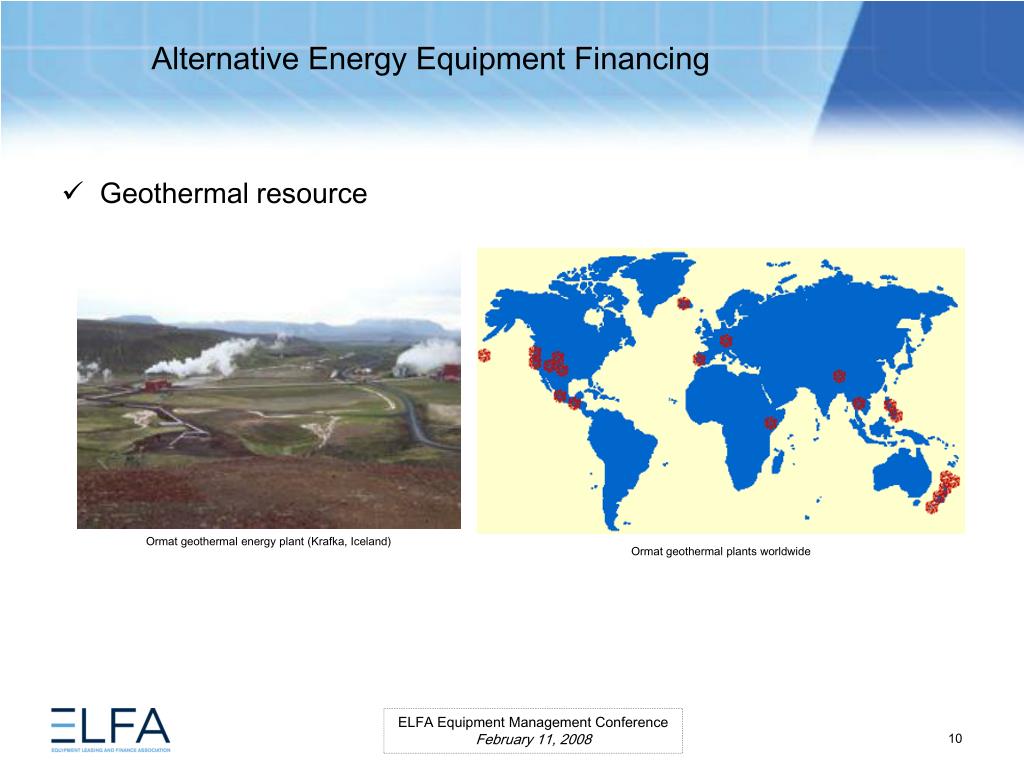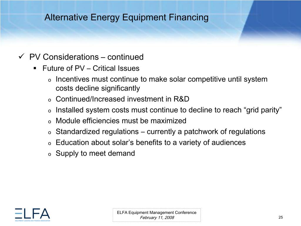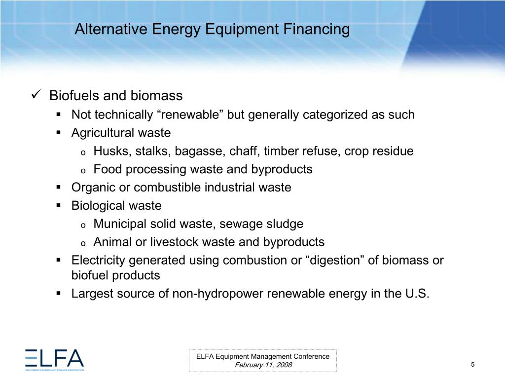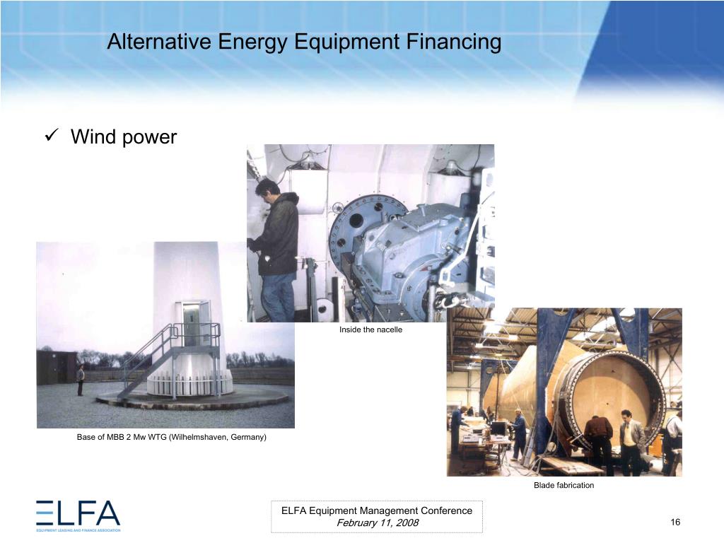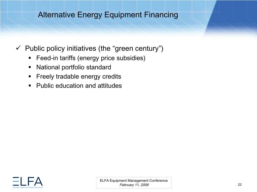 Alternative Energy Equipment Financing. ELFA Equipment Management Conference Miami, Florida February 11, 2008. Moderator Ms. Lauren Hill Senior Vice President MESIROW FINANCIAL CONSULTING . Panelists Paul Bent Principal The Alta Group, LLC Ms. Kristina Pekarek-Wilhite