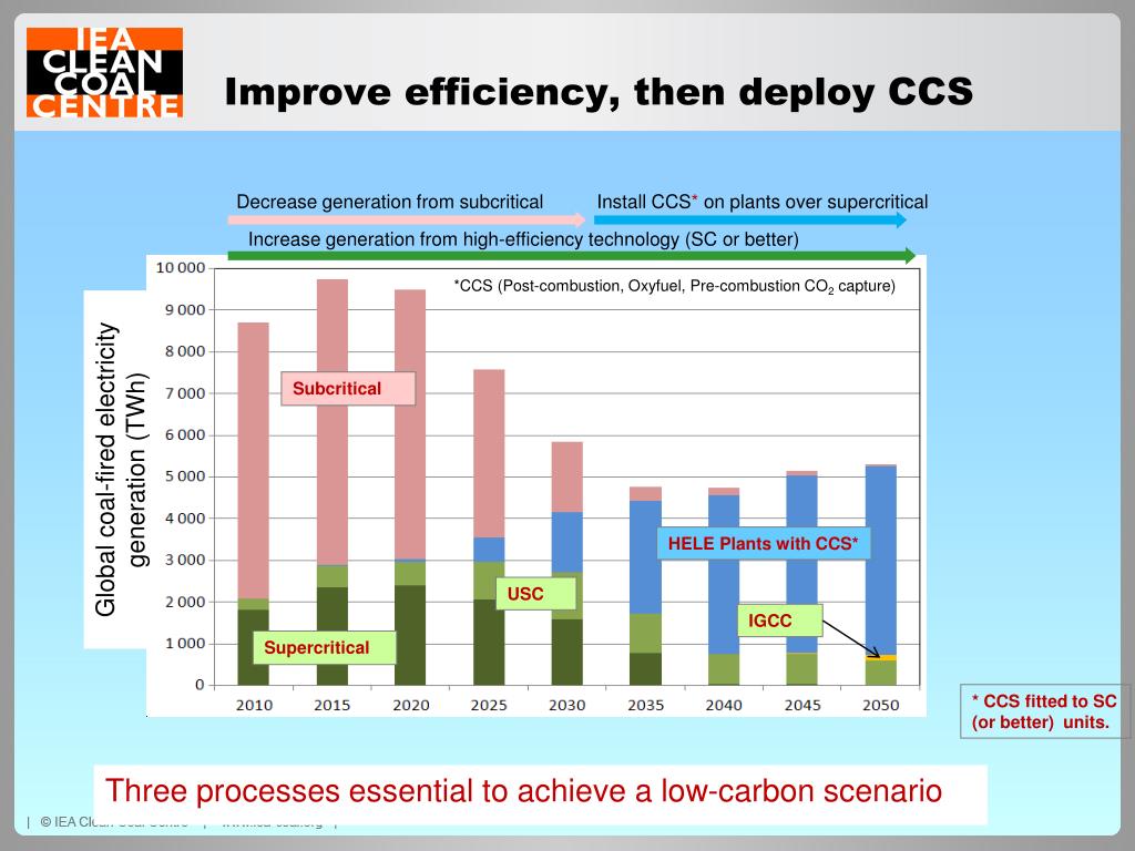 Improve efficiency, then deploy CCS Decrease generation from subcritical Install CCS*on plants over supercritical Increase generation from high-efficiency technology (SC or better) *CCS (Post-combustion, Oxyfuel, Pre-combustion CO2 capture) Subcritical Global coal-fired electricity generation (TWh) HELE Plants with CCS* USC IGCC Supercritical * CCS fitted to SC (or better) units. Three processes essential to achieve a low-carbon scenario