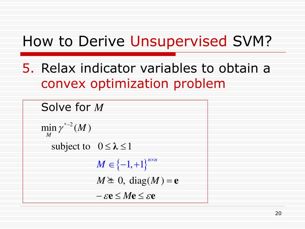 How to Derive Unsupervised SVM? • Relax indicator variables to obtain a convex optimization problem Solve for M Semidefinite program
