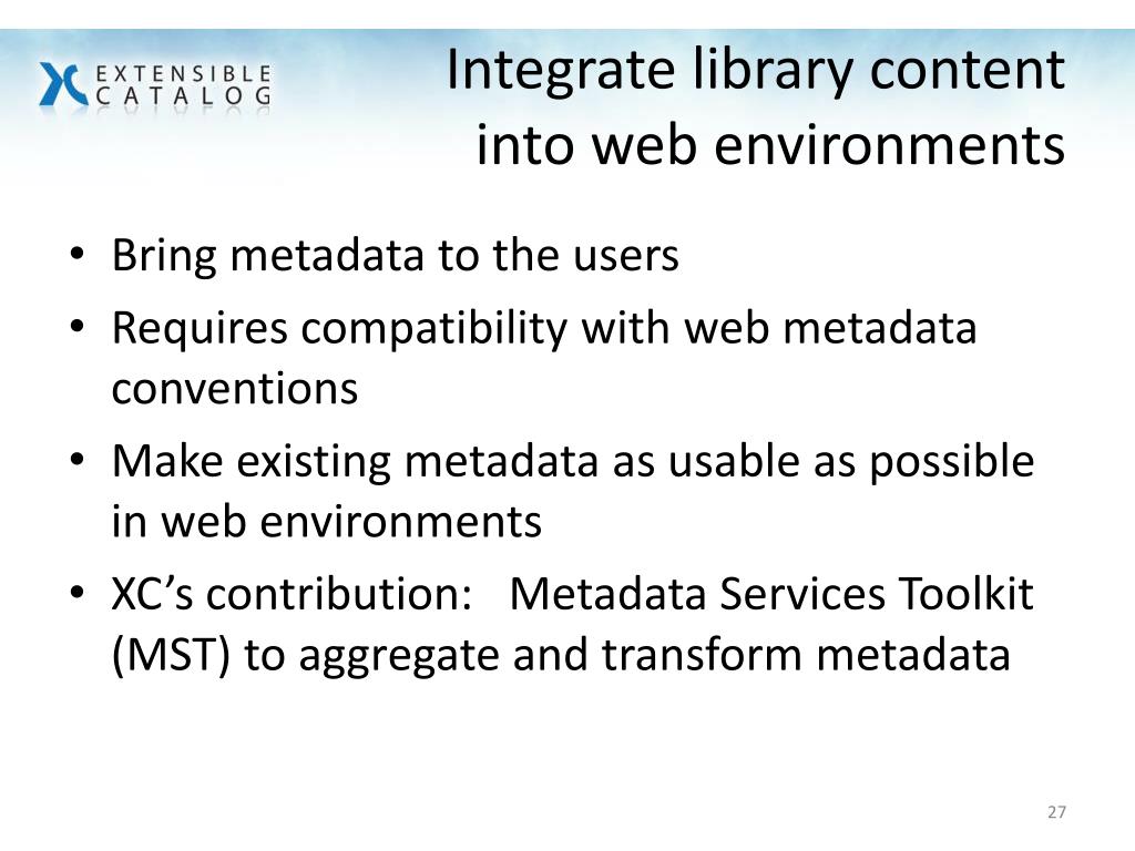 Integrate library content into web environments • Bring metadata to the users • Requires compatibility with web metadata conventions • Make existing metadata as usable as possible in web environments • XC’s contribution: Metadata Services Toolkit (MST) to aggregate and transform metadata