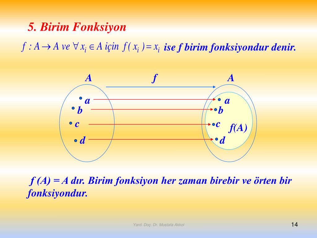 A A a b a b c c d d 5. Birim Fonksiyon ise f birim fonksiyondur denir. f f(A) f (A) = A dır. Birim fonksiyon her zaman birebir ve örten bir fonksiyondur. Yard. Doç. Dr. Mustafa Akkol