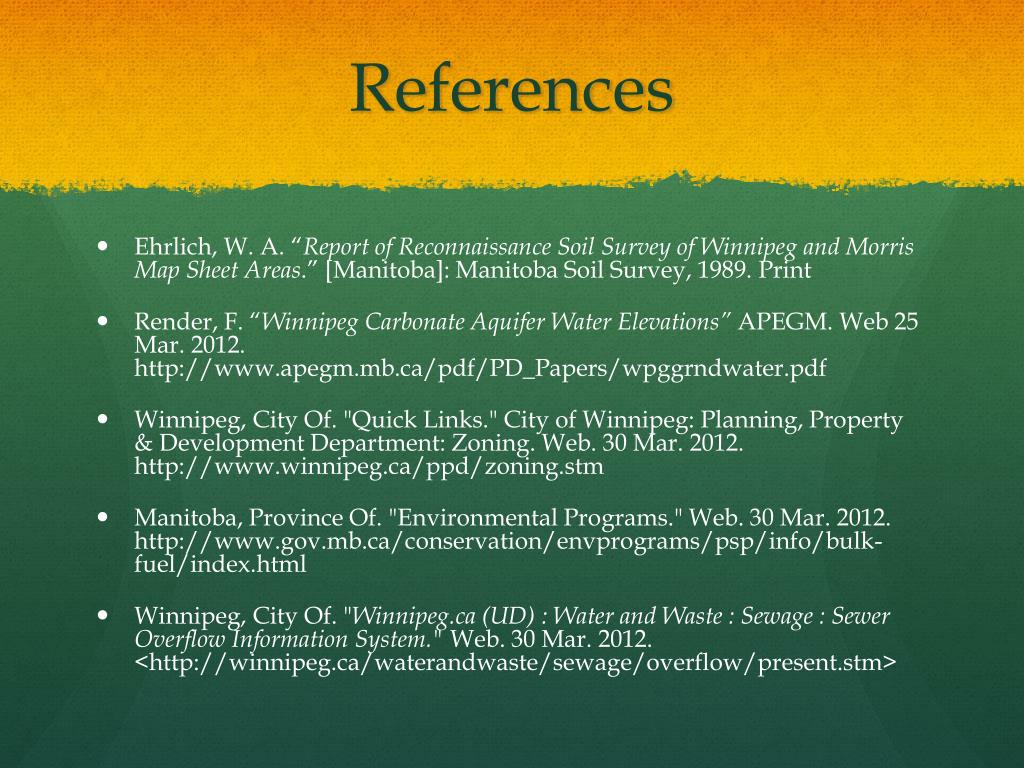 References • Ehrlich, W. A. “Report of Reconnaissance Soil Survey of Winnipeg and Morris Map Sheet Areas.” [Manitoba]: Manitoba Soil Survey, 1989. Print • Render, F. “Winnipeg Carbonate Aquifer Water Elevations” APEGM. Web 25 Mar. 2012. http://www.apegm.mb.ca/pdf/PD_Papers/wpggrndwater.pdf • Winnipeg, City Of. "Quick Links." City of Winnipeg: Planning, Property & Development Department: Zoning. Web. 30 Mar. 2012. http://www.winnipeg.ca/ppd/zoning.stm • Manitoba, Province Of. "Environmental Programs." Web. 30 Mar. 2012. http://www.gov.mb.ca/conservation/envprograms/psp/info/bulk-fuel/index.html • Winnipeg, City Of. "Winnipeg.ca (UD) : Water and Waste : Sewage : Sewer Overflow Information System." Web. 30 Mar. 2012. <http://winnipeg.ca/waterandwaste/sewage/overflow/present.stm>
