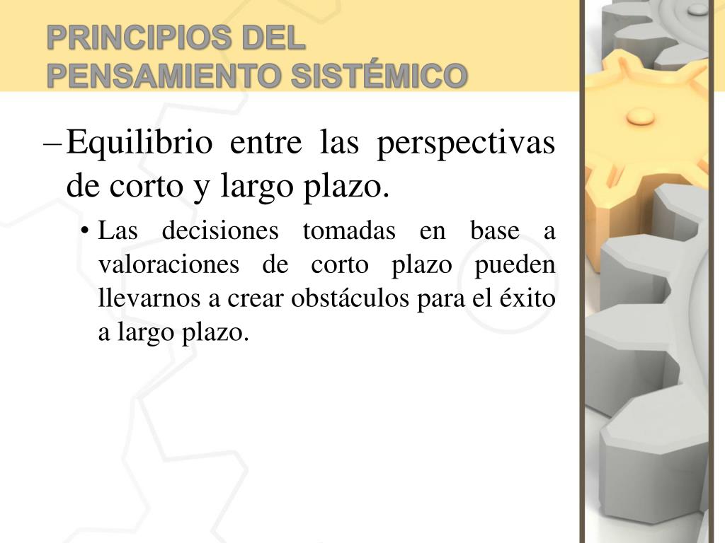 PRINCIPIOS DEL PENSAMIENTO SISTÉMICO • Equilibrio entre las perspectivas de corto y largo plazo. • Las decisiones tomadas en base a valoraciones de corto plazo pueden llevarnos a crear obstáculos para el éxito a largo plazo.