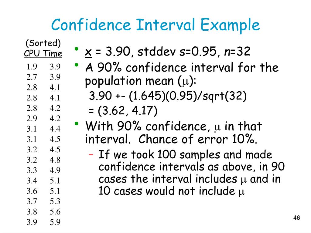(Sorted) CPU Time 1.9 2.7 2.8 2.8 2.8 2.9 3.1 3.1 3.2 3.2 3.3 3.4 3.6 3.7 3.8 3.9 3.9 3.9 4.1 4.1 4.2 4.2 4.4 4.5 4.5 4.8 4.9 5.1 5.1 5.3 5.6 5.9 Confidence Interval Example • x = 3.90, stddev s=0.95, n=32 • A 90% confidence interval for the population mean (): 3.90 +- (1.645)(0.95)/sqrt(32) = (3.62, 4.17) • With 90% confidence, in that interval. Chance of error 10%. • If we took 100 samples and made confidence intervals as above, in 90 cases the interval includes and in 10 cases would not include