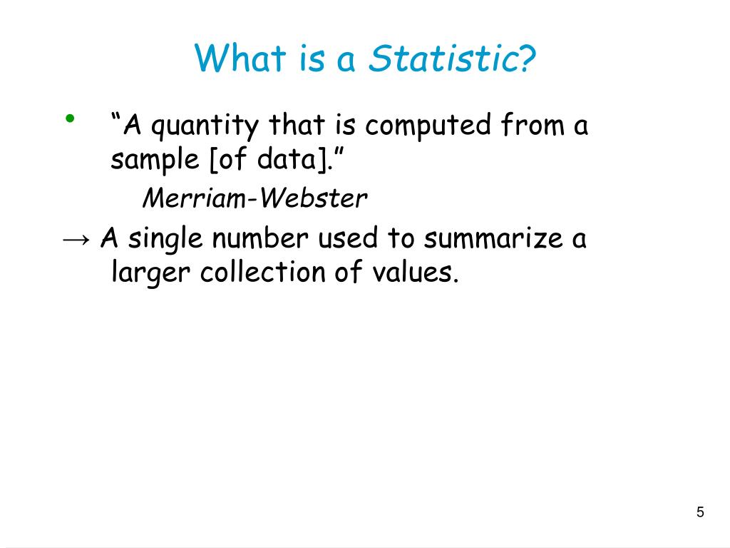 What is a Statistic? • “A quantity that is computed from a sample [of data].” Merriam-Webster → A single number used to summarize a larger collection of values.