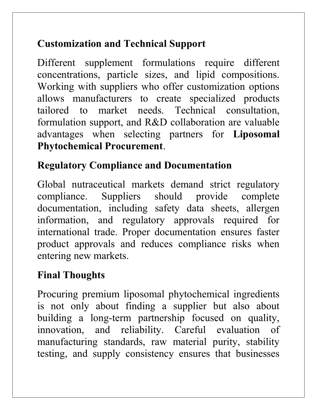 Customization and Technical Support Different supplement formulations require different concentrations, particle sizes, and lipid compositions. Working with suppliers who offer customization options allows manufacturers to create specialized products tailored to market needs. Technical consultation, formulation support, and R&D collaboration are valuable advantages when selecting partners for Liposomal Phytochemical Procurement. Regulatory Compliance and Documentation Global nutraceutical markets demand strict regulatory compliance. Suppliers should documentation, including safety data sheets, allergen information, and regulatory approvals required for international trade. Proper documentation ensures faster product approvals and reduces compliance risks when entering new markets. provide complete Final Thoughts Procuring premium liposomal phytochemical ingredients is not only about finding a supplier but also about building a long-term partnership focused on quality, innovation, and reliability. Careful evaluation of manufacturing standards, raw material purity, stability testing, and supply consistency ensures that businesses