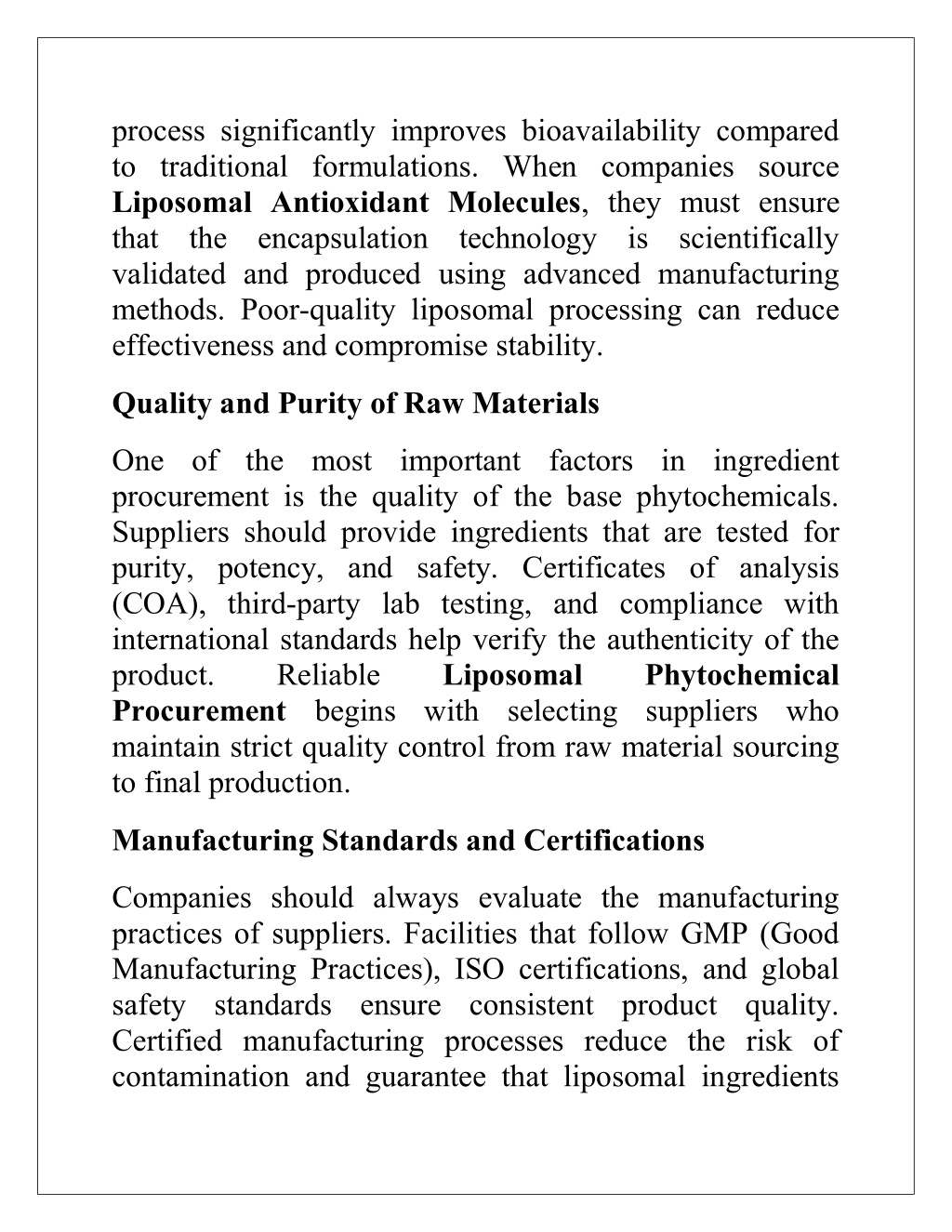 process significantly improves bioavailability compared to traditional formulations. When companies source Liposomal Antioxidant Molecules, they must ensure that the encapsulation technology is scientifically validated and produced using advanced manufacturing methods. Poor-quality liposomal processing can reduce effectiveness and compromise stability. Quality and Purity of Raw Materials One of the most important factors in ingredient procurement is the quality of the base phytochemicals. Suppliers should provide ingredients that are tested for purity, potency, and safety. Certificates of analysis (COA), third-party lab testing, and compliance with international standards help verify the authenticity of the product. Reliable Liposomal Procurement begins with selecting suppliers who maintain strict quality control from raw material sourcing to final production. Phytochemical Manufacturing Standards and Certifications Companies should always evaluate the manufacturing practices of suppliers. Facilities that follow GMP (Good Manufacturing Practices), ISO certifications, and global safety standards ensure consistent product quality. Certified manufacturing processes reduce the risk of contamination and guarantee that liposomal ingredients