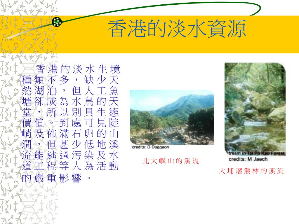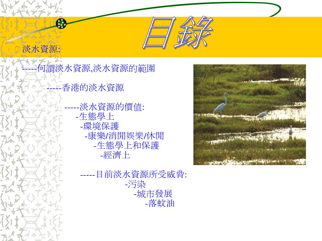 目錄 淡水資源: -----何謂淡水資源,淡水資源的範圍 -----香港的淡水資源 -----淡水資源的價值: -生態學上 -環境保護 -康樂/消閒娛樂/休閒 -生態學上和保護 -經濟上 -----目前淡水資源所受威脅: -污染 -城市發展 -落蚊油