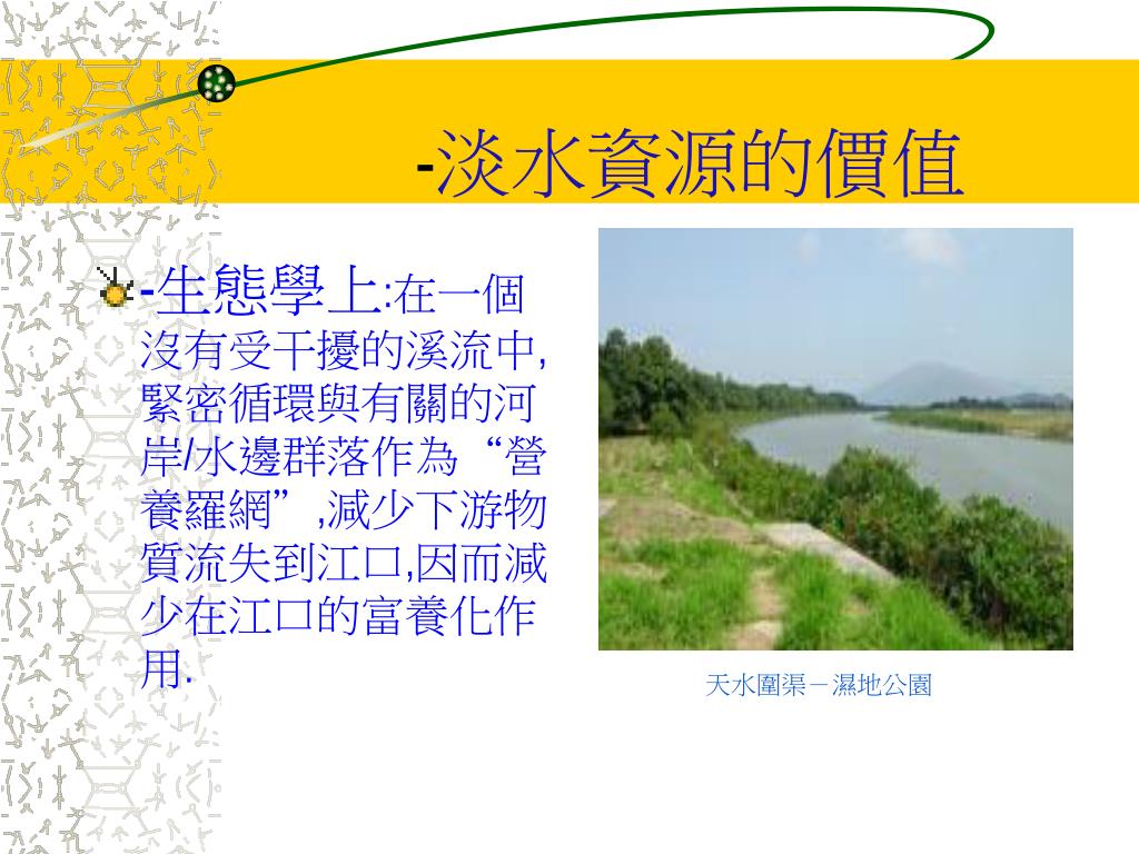-淡水資源的價值 • -生態學上:在一個沒有受干擾的溪流中,緊密循環與有關的河岸/水邊群落作為“營養羅網”,減少下游物質流失到江口,因而減少在江口的富養化作用. 天水圍渠-濕地公園