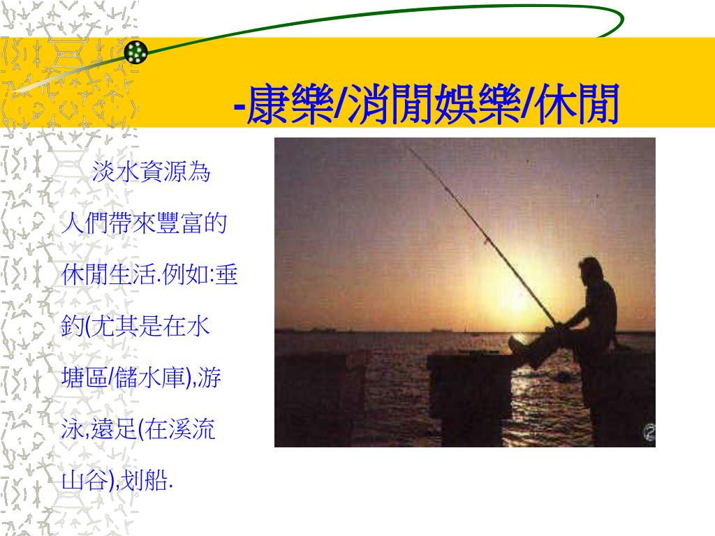 -康樂/消閒娛樂/休閒 淡水資源為 人們帶來豐富的 休閒生活.例如:垂 釣(尤其是在水 塘區/儲水庫),游 泳,遠足(在溪流 山谷),划船.