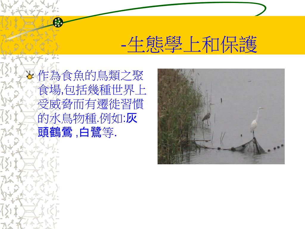 -生態學上和保護 • 作為食魚的鳥類之聚食場,包括幾種世界上受威脅而有遷徙習慣的水鳥物種.例如:灰頭鶴鶯,白鷺等.