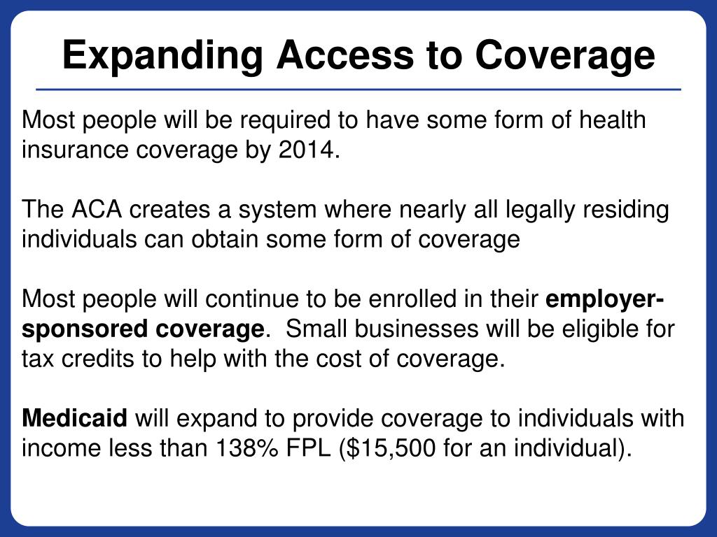 Expanding Access to Coverage Most people will be required to have some form of health insurance coverage by 2014. The ACA creates a system where nearly all legally residing individuals can obtain some form of coverage Most people will continue to be enrolled in their employer-sponsored coverage. Small businesses will be eligible for tax credits to help with the cost of coverage. Medicaidwill expand to provide coverage to individuals with income less than 138% FPL ($15,500 for an individual).