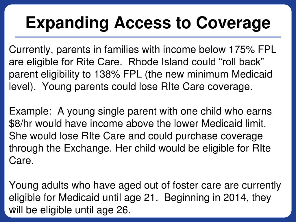 Expanding Access to Coverage Currently, parents in families with income below 175% FPL are eligible for Rite Care. Rhode Island could “roll back” parent eligibility to 138% FPL (the new minimum Medicaid level). Young parents could lose RIte Care coverage. Example: A young single parent with one child who earns $8/hr would have income above the lower Medicaid limit. She would lose RIte Care and could purchase coverage through the Exchange. Her child would be eligible for RIte Care. Young adults who have aged out of foster care are currently eligible for Medicaid until age 21. Beginning in 2014, they will be eligible until age 26.