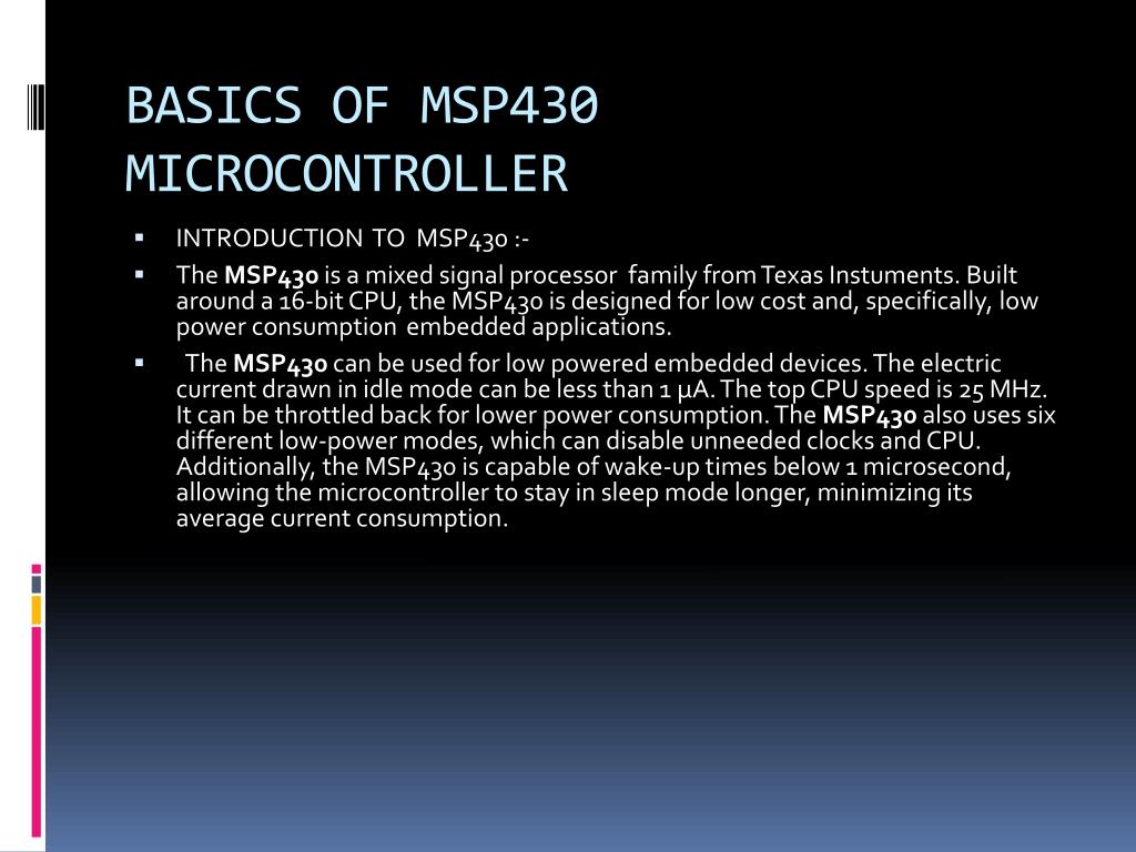 BASICS OF MSP430 MICROCONTROLLER • INTRODUCTION TO MSP430 :- • The MSP430 is a mixed signal processor family from Texas Instuments. Built around a 16-bit CPU, the MSP430 is designed for low cost and, specifically, low power consumption embedded applications. • The MSP430 can be used for low powered embedded devices. The electric current drawn in idle mode can be less than 1 µA. The top CPU speed is 25 MHz. It can be throttled back for lower power consumption. The MSP430 also uses six different low-power modes, which can disable unneeded clocks and CPU. Additionally, the MSP430 is capable of wake-up times below 1 microsecond, allowing the microcontroller to stay in sleep mode longer, minimizing its average current consumption.