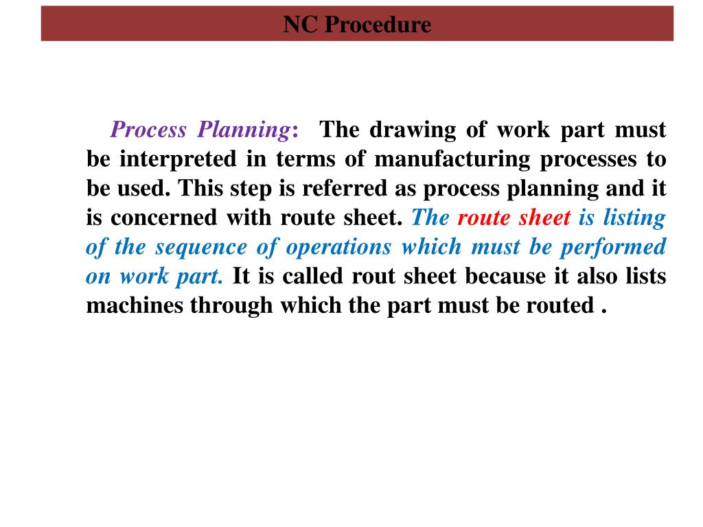 NC Procedure Process Planning: The drawing of work part must be interpreted in terms of manufacturing processes to be used. This step is referred as process planning and it is concerned with route sheet. The route sheet is listing of the sequence of operations which must be performed on work part. It is called rout sheet because it also lists machines through which the part must be routed .