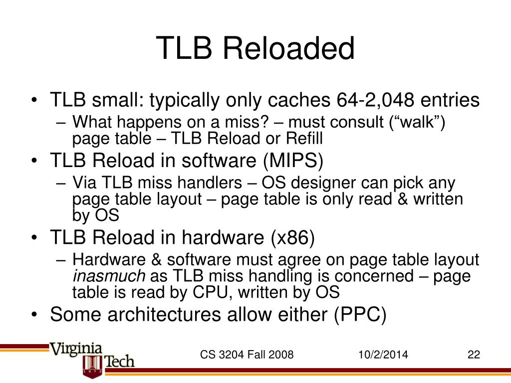 TLB Reloaded • TLB small: typically only caches 64-2,048 entries • What happens on a miss? – must consult (“walk”) page table – TLB Reload or Refill • TLB Reload in software (MIPS) • Via TLB miss handlers – OS designer can pick any page table layout – page table is only read & written by OS • TLB Reload in hardware (x86) • Hardware & software must agree on page table layout inasmuch as TLB miss handling is concerned – page table is read by CPU, written by OS • Some architectures allow either (PPC) CS 3204 Fall 2008