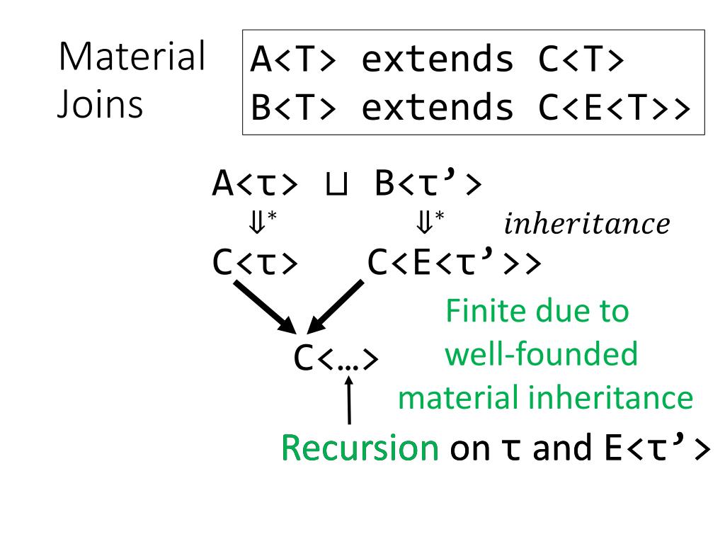MaterialJoins A<T> extends C<T> B<T> extends C<E<T>> A<> B<’> C<> C<E<’>> Finite due to well-founded material inheritance C<…> Recursion on and E<’> Recursion on and E<’>