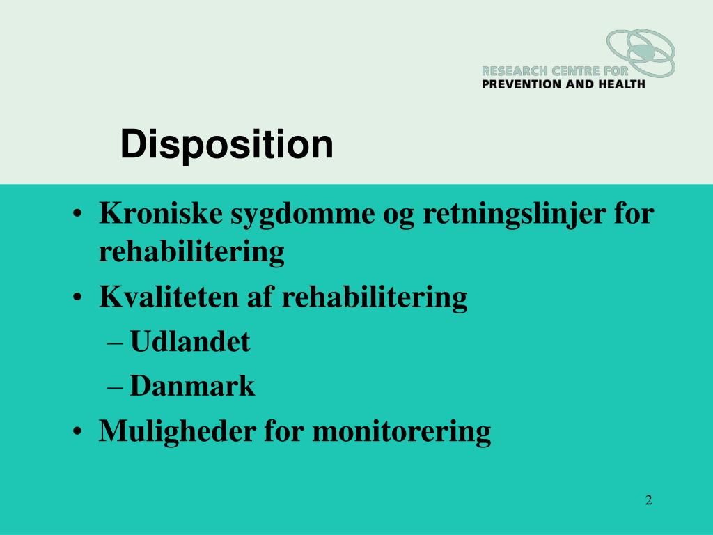 Disposition • Kroniske sygdomme og retningslinjer for rehabilitering • Kvaliteten af rehabilitering • Udlandet • Danmark • Muligheder for monitorering