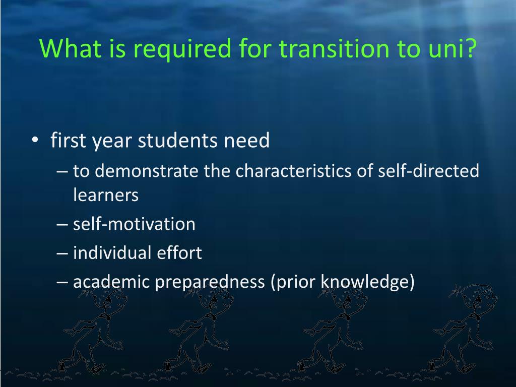 What is required for transition to uni? • first year students need • to demonstrate the characteristics of self-directed learners • self-motivation • individual effort • academic preparedness (prior knowledge)