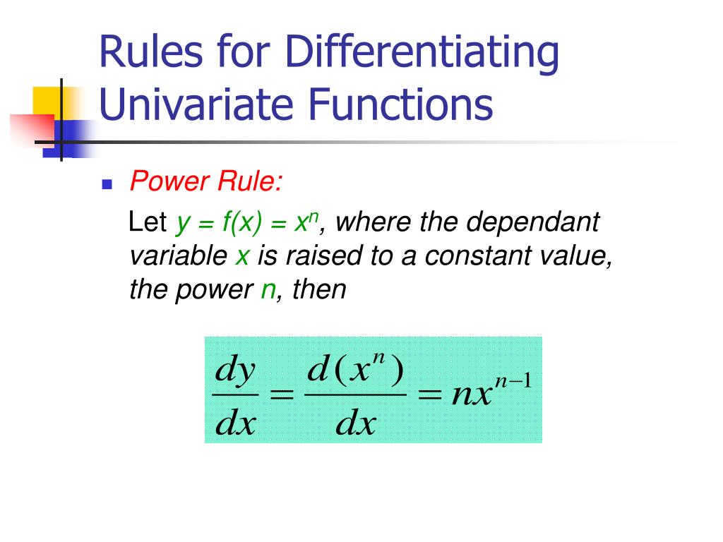 Rules for Differentiating Univariate Functions • Power Rule: Let y = f(x) = xn, where the dependant variable x is raised to a constant value, the power n, then