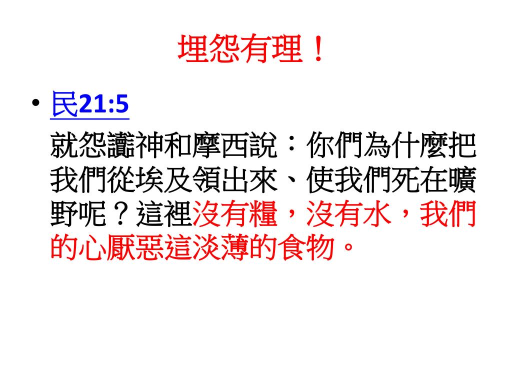 埋怨有理! • 民21:5 就怨讟神和摩西說:你們為什麼把我們從埃及領出來、使我們死在曠野呢?這裡沒有糧,沒有水,我們的心厭惡這淡薄的食物。