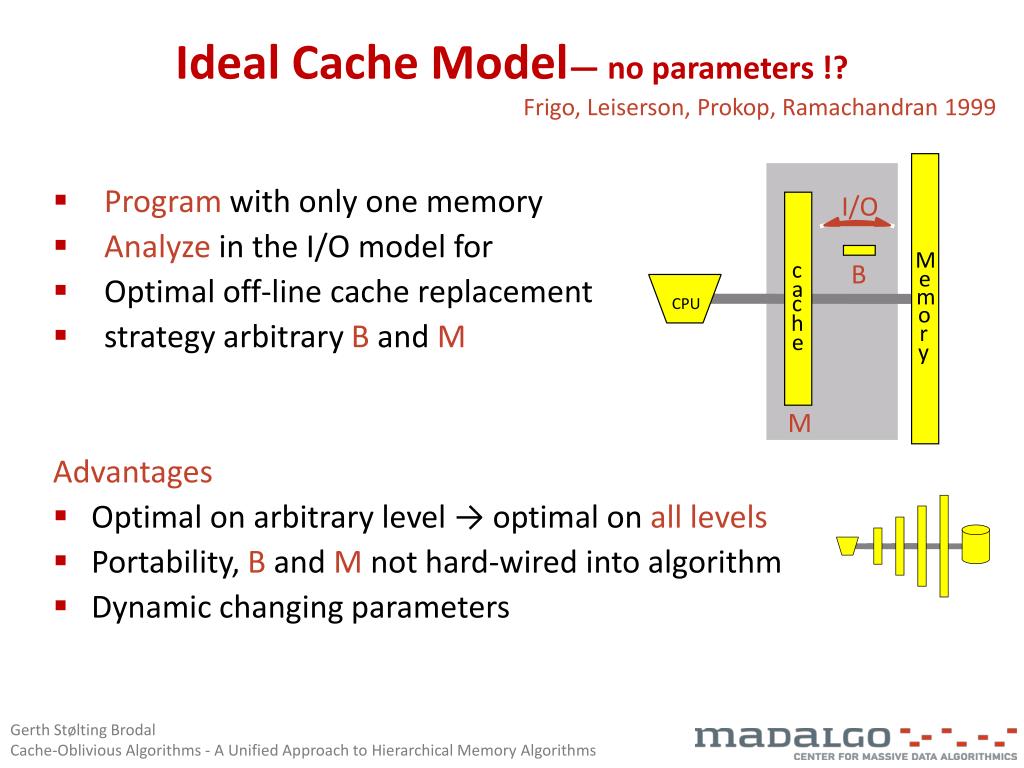 Program with only one memory Analyze in the I/O model for Optimal off-line cache replacement strategy arbitrary B and M Advantages Optimal on arbitrary level → optimal on all levels Portability, B and M not hard-wired into algorithm Dynamic changing parameters I/O M c B e a m c CPU o h r e y M Ideal Cache Model— no parameters !? Frigo, Leiserson, Prokop, Ramachandran 1999