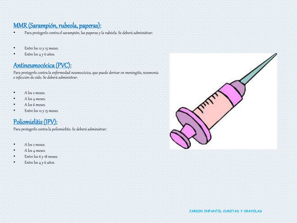 MMR (Sarampión, rubeola, paperas): • Para protegerlo contra el sarampión, las paperas y la rubéola. Se deberá administrar: • Entre los 12 y 15 meses. • Entre los 4 y 6 años. Antineumocócica (PVC): Para protegerlo contra la enfermedad neumocócica, que puede derivar en meningitis, neumonía e infección de oído. Se deberá administrar: • A los 2 meses. • A los 4 meses. • A los 6 meses. • Entre los 12 y 15 meses. Poliomielitis (IPV): Para protegerlo contra la poliomielitis. Se deberá administrar: • A los 2 meses. • A los 4 meses. • Entre los 6 y 18 meses. • Entre los 4 y 6 años. JARDIN INFANTIL CUNITAS Y CRAYOLAS