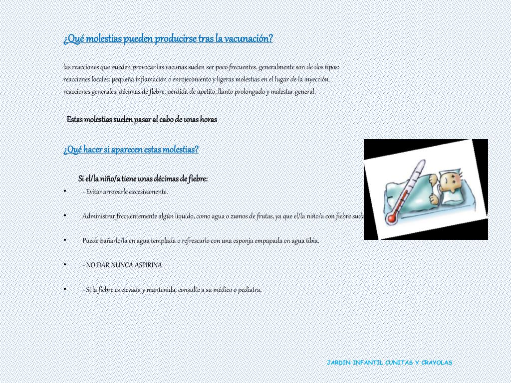 ¿Qué molestias pueden producirse tras la vacunación? las reacciones que pueden provocar las vacunas suelen ser poco frecuentes. generalmente son de dos tipos: reacciones locales: pequeña inflamación o enrojecimiento y ligeras molestias en el lugar de la inyección. reacciones generales: décimas de fiebre, pérdida de apetito, llanto prolongado y malestar general. Estas molestias suelen pasar al cabo de unas horas ¿Qué hacer si aparecen estas molestias? Si el/la niño/a tiene unas décimas de fiebre: • - Evitar arroparle excesivamente. • Administrar frecuentemente algún líquido, como agua o zumos de frutas, ya que el/la niño/a con fiebre suda más de lo habitual. • Puede bañarlo/la en agua templada o refrescarlo con una esponja empapada en agua tibia. • - NO DAR NUNCA ASPIRINA. • - Si la fiebre es elevada y mantenida, consulte a su médico o pediatra. JARDIN INFANTIL CUNITAS Y CRAYOLAS
