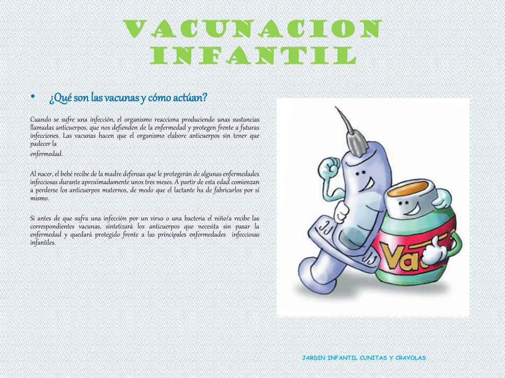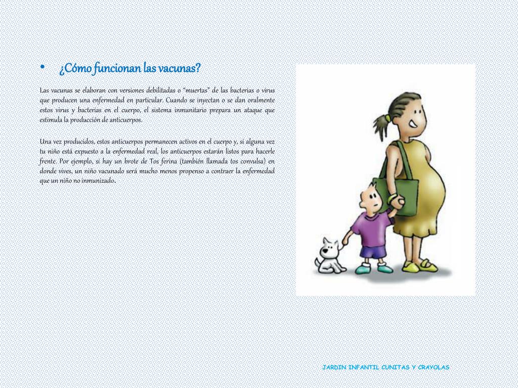 ¿Cómo funcionan las vacunas? Las vacunas se elaboran con versiones debilitadas o “muertas” de las bacterias o virus que producen una enfermedad en particular. Cuando se inyectan o se dan oralmente estos virus y bacterias en el cuerpo, el sistema inmunitario prepara un ataque que estimula la producción de anticuerpos. Una vez producidos, estos anticuerpos permanecen activos en el cuerpo y, si alguna vez tu niño está expuesto a la enfermedad real, los anticuerpos estarán listos para hacerle frente. Por ejemplo, si hay un brote de Tos ferina (también llamada tos convulsa) en donde vives, un niño vacunado será mucho menos propenso a contraer la enfermedad que un niño no inmunizado. JARDIN INFANTIL CUNITAS Y CRAYOLAS