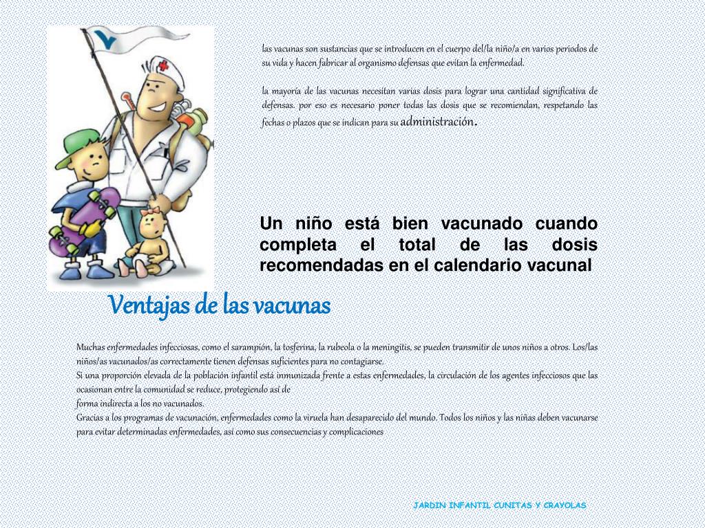las vacunas son sustancias que se introducen en el cuerpo del/la niño/a en varios periodos de su vida y hacen fabricar al organismo defensas que evitan la enfermedad. la mayoría de las vacunas necesitan varias dosis para lograr una cantidad significativa de defensas. por eso es necesario poner todas las dosis que se recomiendan, respetando las fechas o plazos que se indican para su administración. Un niño está bien vacunado cuando completa el total de las dosis recomendadas en el calendario vacunal Ventajas de las vacunas Muchas enfermedades infecciosas, como el sarampión, la tosferina, la rubeola o la meningitis, se pueden transmitir de unos niños a otros. Los/las niños/as vacunados/as correctamente tienen defensas suficientes para no contagiarse. Si una proporción elevada de la población infantil está inmunizada frente a estas enfermedades, la circulación de los agentes infecciosos que las ocasionan entre la comunidad se reduce, protegiendo así de forma indirecta a los no vacunados. Gracias a los programas de vacunación, enfermedades como la viruela han desaparecido del mundo. Todos los niños y las niñas deben vacunarse para evitar determinadas enfermedades, así como sus consecuencias y complicaciones JARDIN INFANTIL CUNITAS Y CRAYOLAS