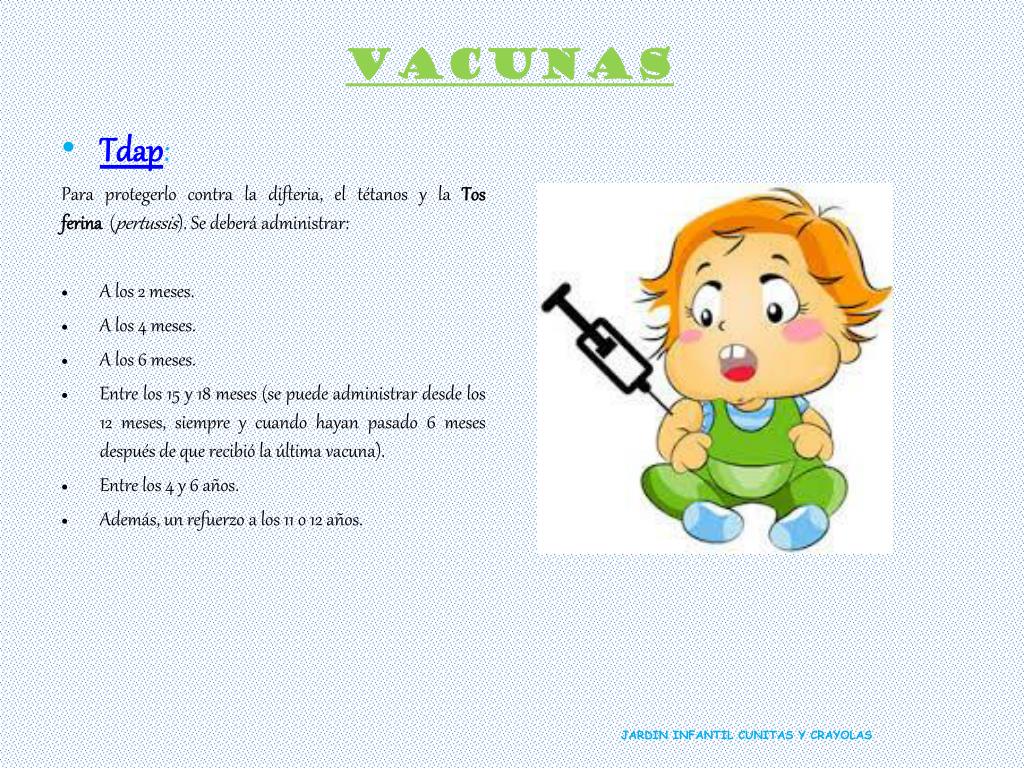 VACUNAS • Tdap: Para protegerlo contra la difteria, el tétanos y la Tos ferina (pertussis). Se deberá administrar: • A los 2 meses. • A los 4 meses. • A los 6 meses. • Entre los 15 y 18 meses (se puede administrar desde los 12 meses, siempre y cuando hayan pasado 6 meses después de que recibió la última vacuna). • Entre los 4 y 6 años. • Además, un refuerzo a los 11 o 12 años. JARDIN INFANTIL CUNITAS Y CRAYOLAS