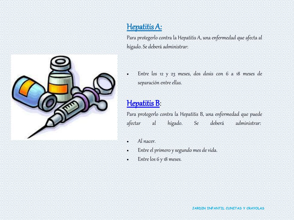 Hepatitis A: • Para protegerlo contra la Hepatitis A, una enfermedad que afecta al hígado. Se deberá administrar: • Entre los 12 y 23 meses, dos dosis con 6 a 18 meses de separación entre ellas. • Hepatitis B: • Para protegerlo contra la Hepatitis B, una enfermedad que puede afectar al hígado. Se deberá administrar: • Al nacer. • Entre el primero y segundo mes de vida. • Entre los 6 y 18 meses. JARDIN INFANTIL CUNITAS Y CRAYOLAS
