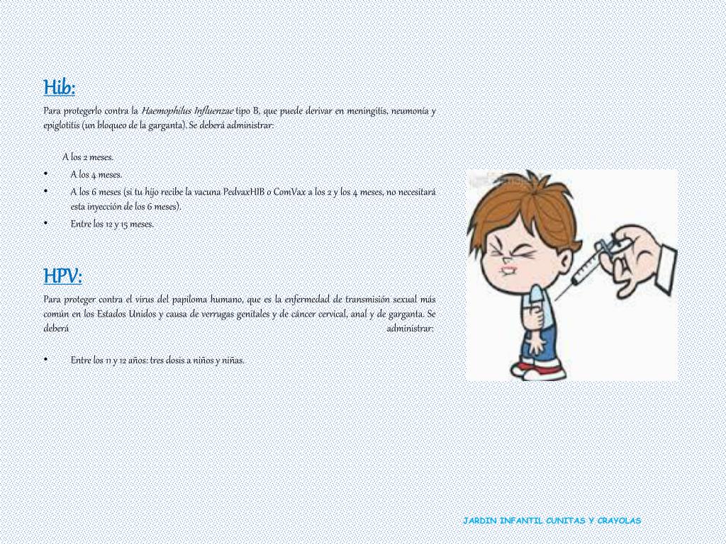 Hib: Para protegerlo contra la Haemophilus Influenzae tipo B, que puede derivar en meningitis, neumonía y epiglotitis (un bloqueo de la garganta). Se deberá administrar: A los 2 meses. • A los 4 meses. • A los 6 meses (si tu hijo recibe la vacuna PedvaxHIB o ComVax a los 2 y los 4 meses, no necesitará esta inyección de los 6 meses). • Entre los 12 y 15 meses. HPV: Para proteger contra el virus del papiloma humano, que es la enfermedad de transmisión sexual más común en los Estados Unidos y causa de verrugas genitales y de cáncer cervical, anal y de garganta. Se deberá administrar: • Entre los 11 y 12 años: tres dosis a niños y niñas. JARDIN INFANTIL CUNITAS Y CRAYOLAS