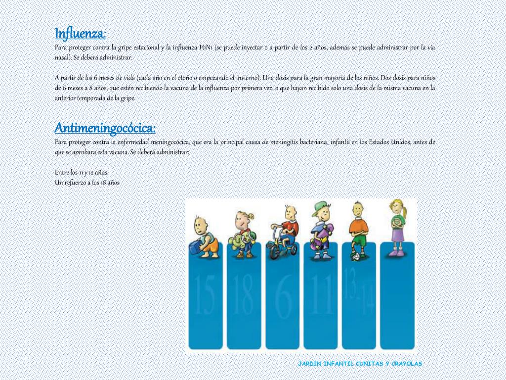 Influenza: • Para proteger contra la gripe estacional y la influenza H1N1 (se puede inyectar o a partir de los 2 años, además se puede administrar por la vía nasal). Se deberá administrar: • A partir de los 6 meses de vida (cada año en el otoño o empezando el invierno). Una dosis para la gran mayoría de los niños. Dos dosis para niños de 6 meses a 8 años, que estén recibiendo la vacuna de la influenza por primera vez, o que hayan recibido solo una dosis de la misma vacuna en la anterior temporada de la gripe. • Antimeningocócica: • Para proteger contra la enfermedad meningocócica, que era la principal causa demeningitis bacteriana infantil en los Estados Unidos, antes de que se aprobara esta vacuna. Se deberá administrar: • Entre los 11 y 12 años. • Un refuerzo a los 16 años JARDIN INFANTIL CUNITAS Y CRAYOLAS