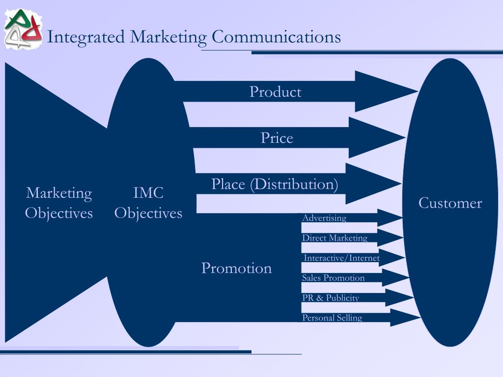 Integrated Marketing Communications IMC Objectives Customer Product Price Marketing Objectives Place (Distribution) Advertising Promotion Direct Marketing Interactive/Internet Sales Promotion PR & Publicity Personal Selling