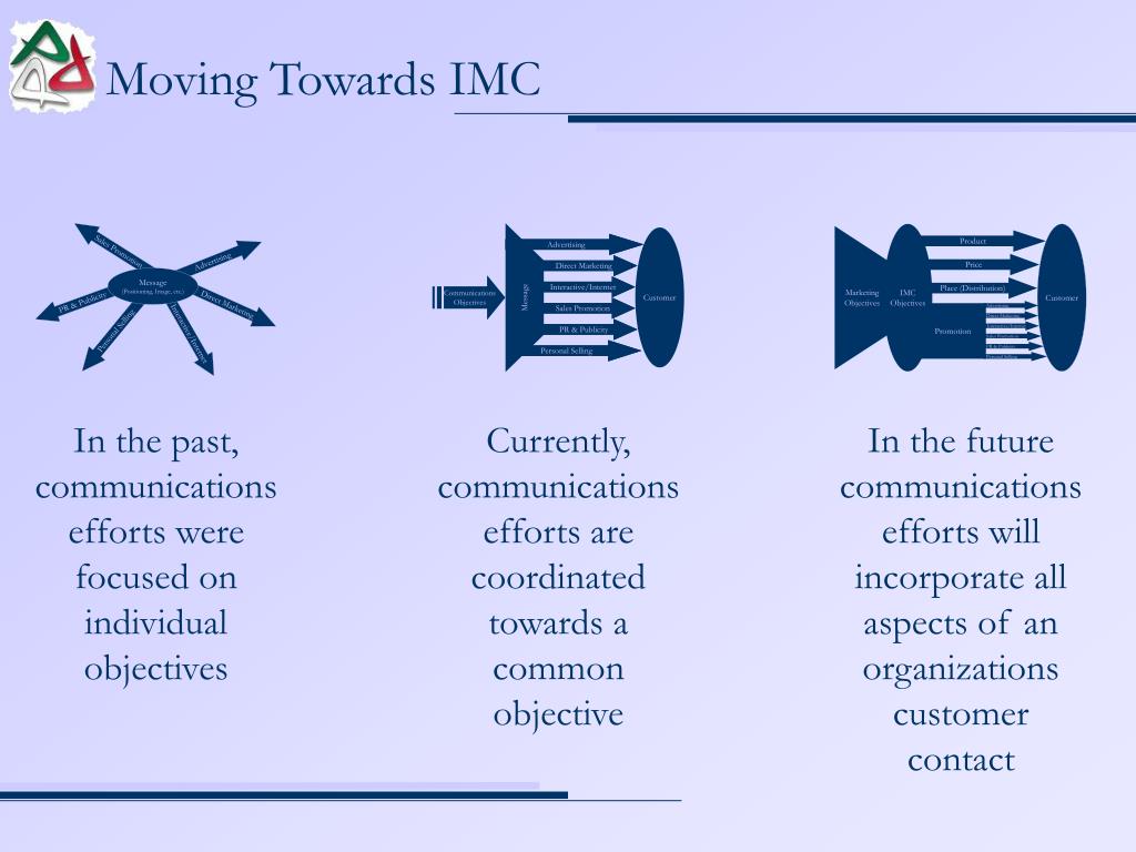 In the past, communications efforts were focused on individual objectives Currently, communications efforts are coordinated towards a common objective In the future communications efforts will incorporate all aspects of an organizations customer contact Moving Towards IMC