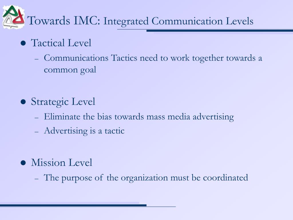Towards IMC: Integrated Communication Levels • Tactical Level • Communications Tactics need to work together towards a common goal • Strategic Level • Eliminate the bias towards mass media advertising • Advertising is a tactic • Mission Level • The purpose of the organization must be coordinated