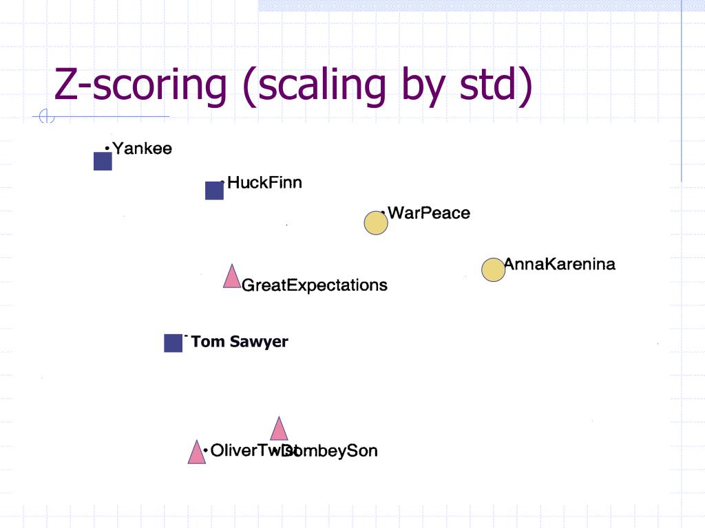 Standardisation of features • Yik = (Xik –Ak)/Bk • X - original data • Y – standardised data • i – entities • k – features • Ak – shift of the origin, typically, the average • Bk – rescaling factor, traditionally the standard deviation, but range may be better in clustering