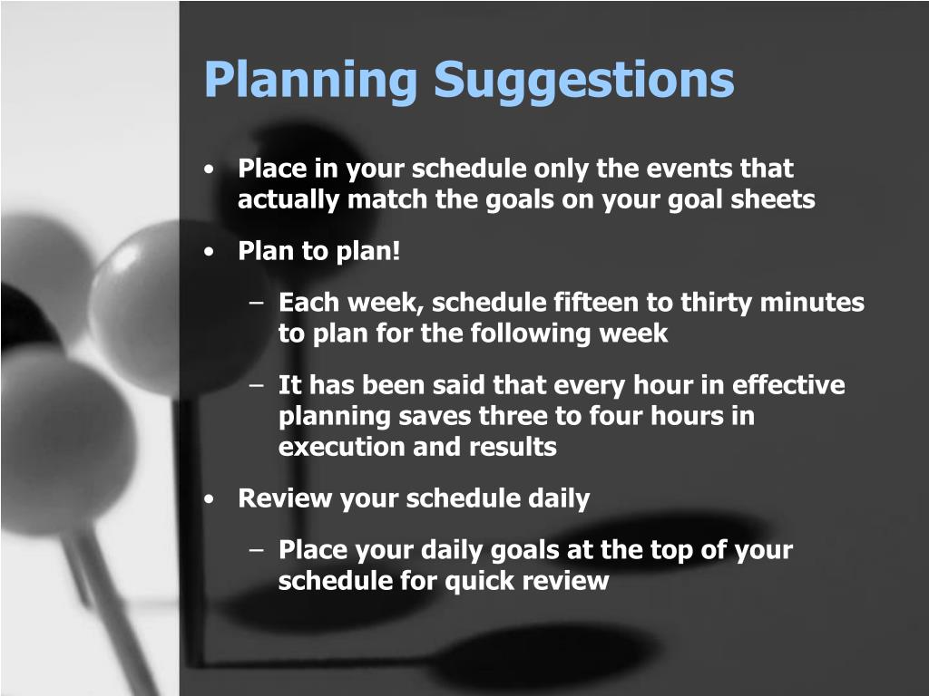 Planning Suggestions • Place in your schedule only the events that actually match the goals on your goal sheets • Plan to plan! • Each week, schedule fifteen to thirty minutes to plan for the following week • It has been said that every hour in effective planning saves three to four hours in execution and results • Review your schedule daily • Place your daily goals at the top of your schedule for quick review