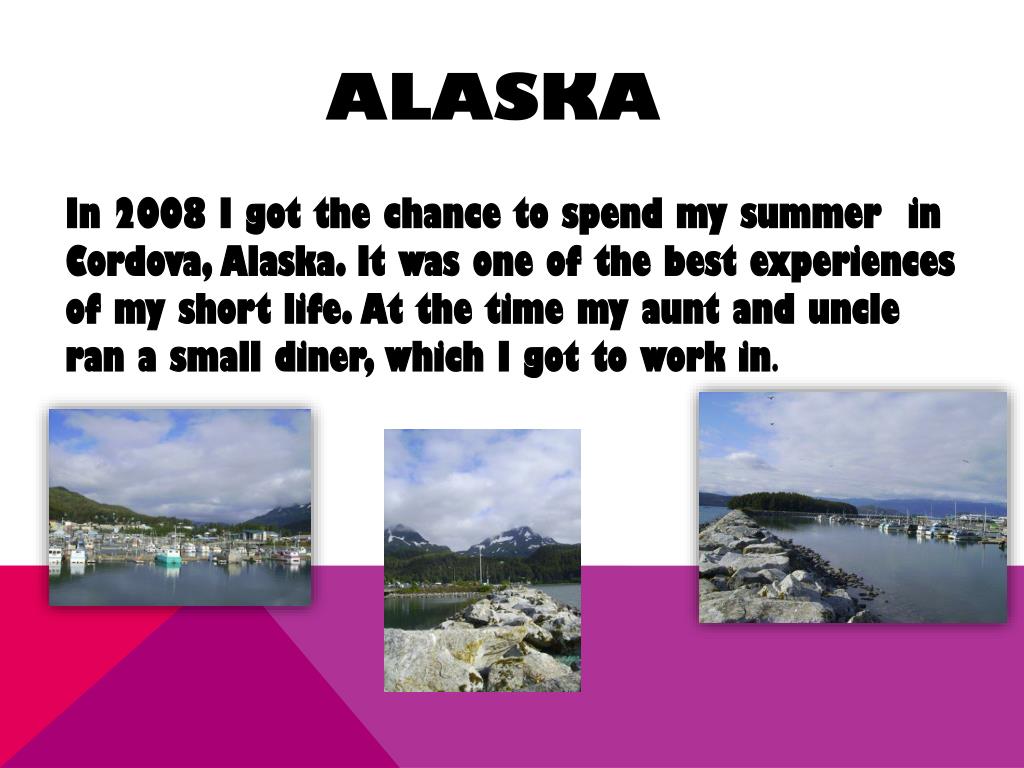 Alaska In 2008 I got the chance to spend my summer in Cordova, Alaska. It was one of the best experiences of my short life. At the time my aunt and uncle ran a small diner, which I got to work in.