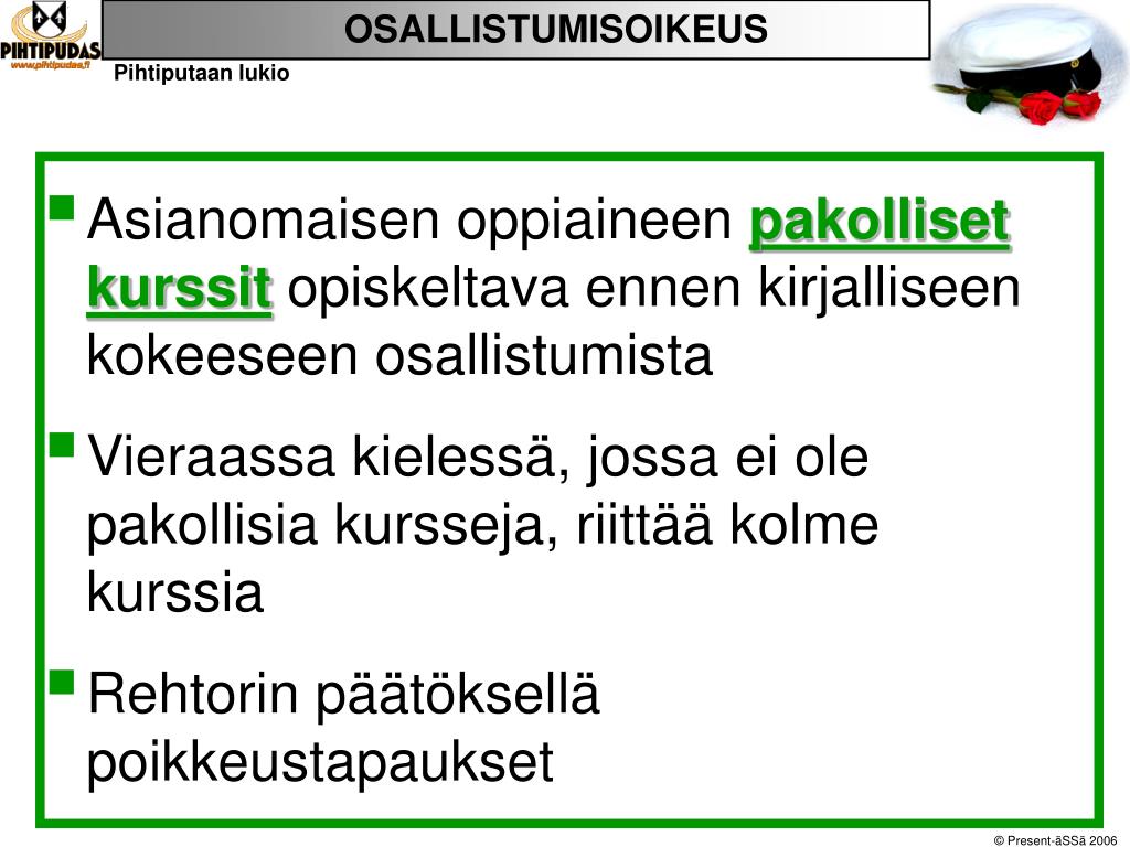 OSALLISTUMISOIKEUS • Asianomaisen oppiaineen pakolliset kurssit opiskeltava ennen kirjalliseen kokeeseen osallistumista • Vieraassa kielessä, jossa ei ole pakollisia kursseja, riittää kolme kurssia • Rehtorin päätöksellä poikkeustapaukset