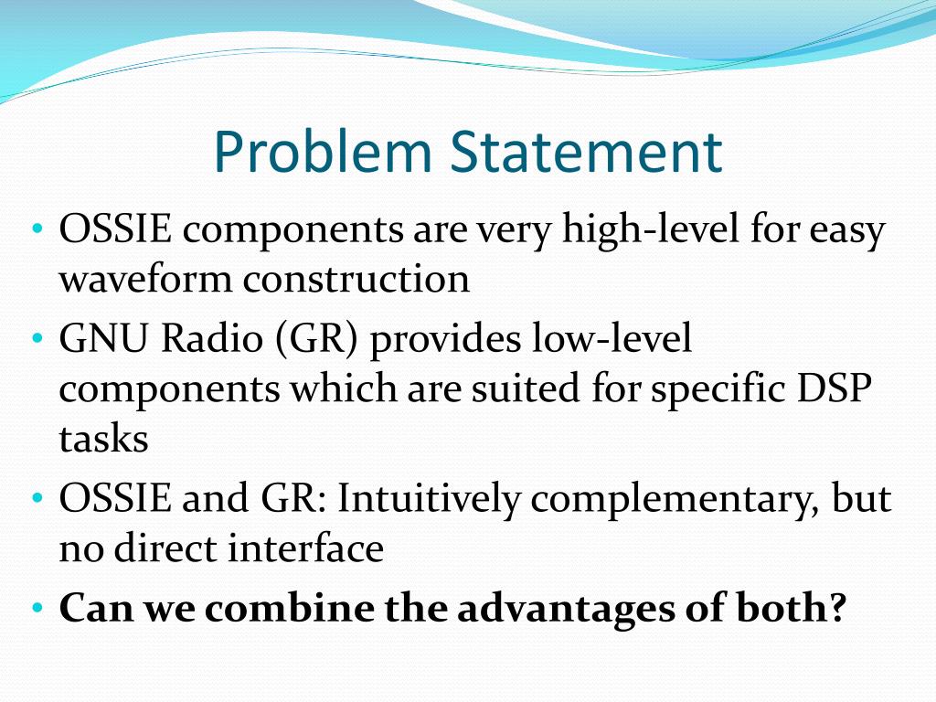 Problem Statement • OSSIE components are very high-level for easy waveform construction • GNU Radio (GR) provides low-level components which are suited for specific DSP tasks • OSSIE and GR: Intuitively complementary, but no direct interface • Can we combine the advantages of both?
