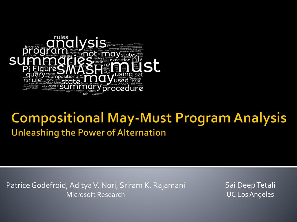 Compositional May-Must Program Analysis Unleashing the Power of Alternation Sai Deep Tetali UC Los Angeles Patrice Godefroid, Aditya V. Nori, Sriram K. Rajamani Microsoft Research
