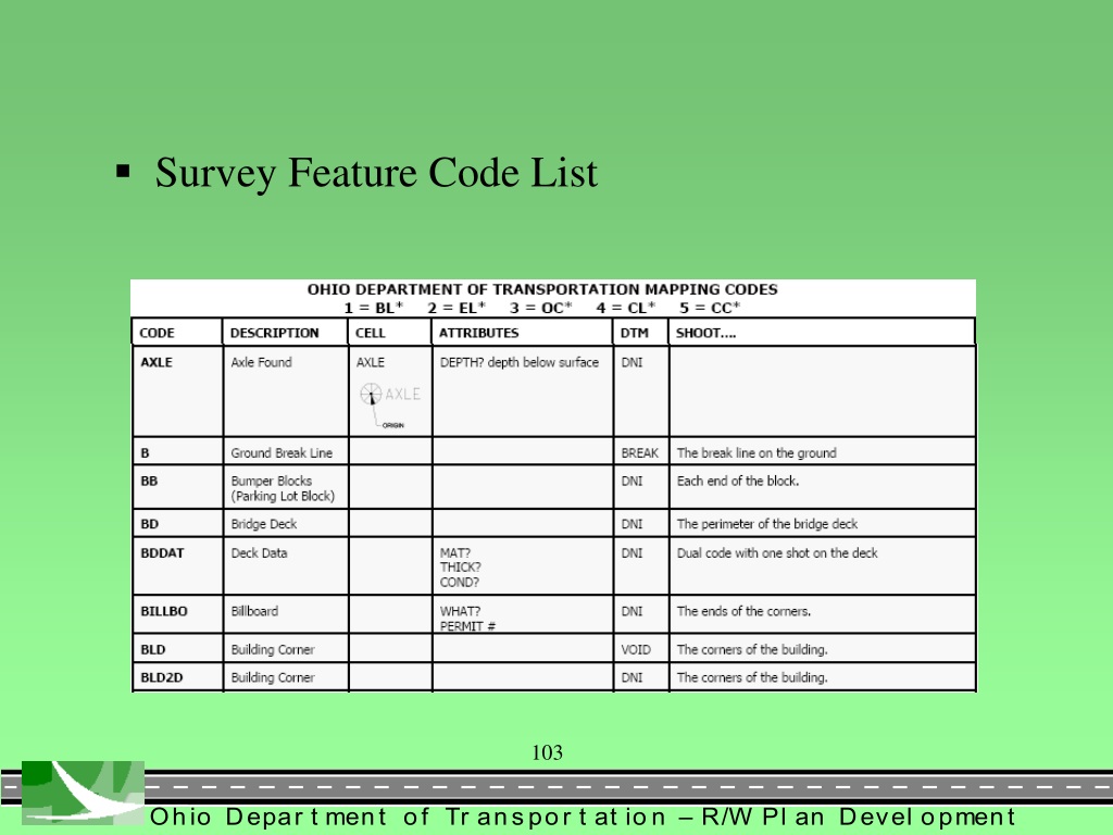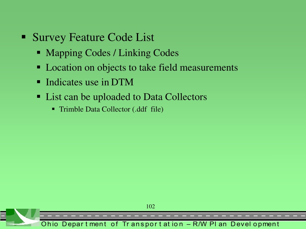 Field Survey for R/W Plans • Field Survey for Right of Way Plans • Survey Manager Database (SMD) file • Survey Feature Code List for data collection • Topographic items • Existing Utilities • Ohio Utility Protection Service (OUPS) • Oil and Gas Producers Underground Protection Services (OGPUPS) • Subsurface Utility Engineering (SUE) • Property Monumentation • Right of Way Monumentation
