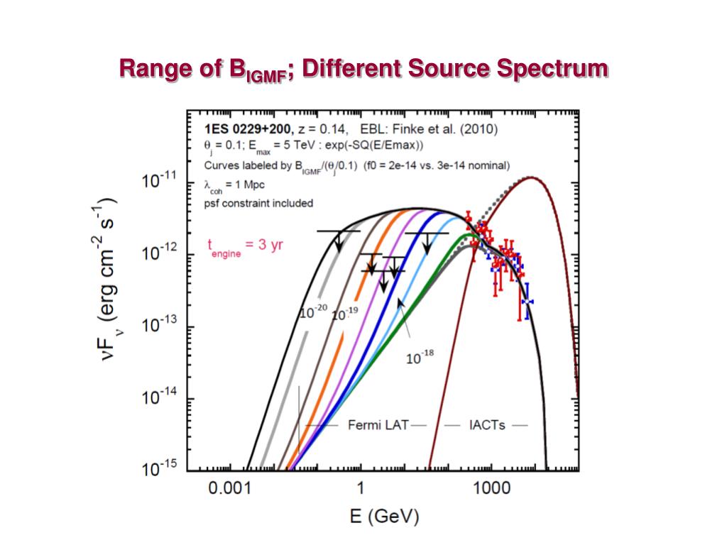 Lower Limits on the Intergalactic Magnetic Field Use Fermi upper limits or detections at GeV energies to limit BIGMF given TeV data and EBL model e+ g e- ? BIGMF > 10-15 G ~ (Neronov & Vovk 2010; Tavecchio et al. 2010) BIGMF > 10-18 G ~ (relaxing assumption of extended TeV emission) (CD, Cavadini, Razzaque, Finke, Chiang, Lott, 2011)