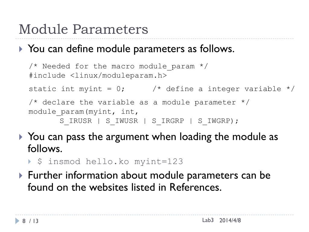 Module Parameters /* Needed for the macro module_param */ #include <linux/moduleparam.h> static int myint = 0; /* define a integer variable */ /* declare the variable as a module parameter */ module_param(myint, int, S_IRUSR | S_IWUSR | S_IRGRP | S_IWGRP); / 13 • You can define module parameters as follows. • You can pass the argument when loading the module as follows. • $ insmod hello.komyint=123 • Further information about module parameters can be found on the websites listed in References.